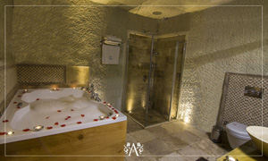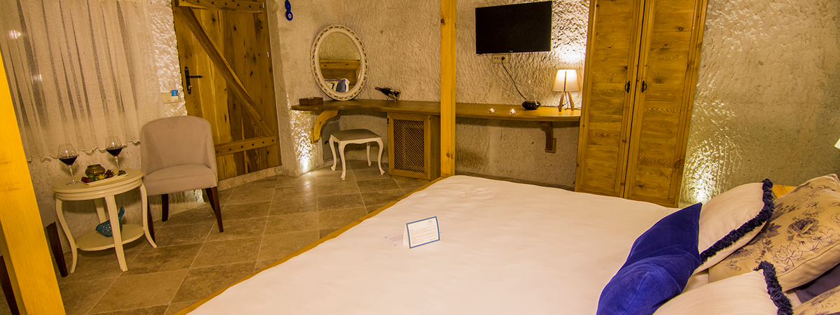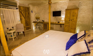 Lovingly created to reflect authentic luxury and simplicity at the same time, this Superior Cave Suite has a romantic atmosphere. The four-poster bed and the Jacuzzi for 2 will take you to a phase of relaxation and peace.