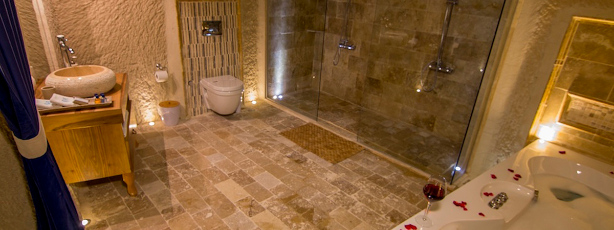 Grand Cave Suite is one of our largest caves and strikes mainly with a large living room area including a big flat screen TV. The bathroom offers a double shower and a large Jacuzzi for two.