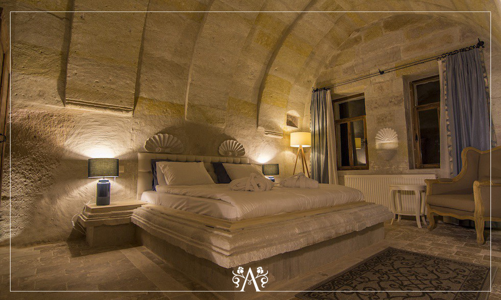 The President Cave Suite is a very special cave with a wonderful balcony where you can see the Cavusin castle and the balloons in the morning. This cave has a large living room with fireplace and large flat screen TV. The bedroom consists of a spacious half-cave, half-arched room with a large window overlooking the magnificent Cavusin castle and the village. The bathroom is spacious and offers a double jacuzzi.
