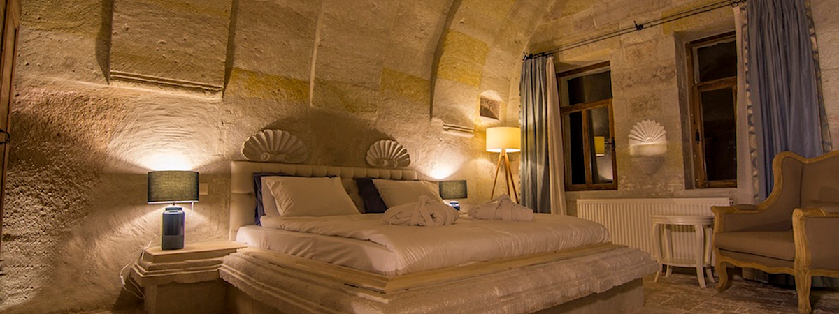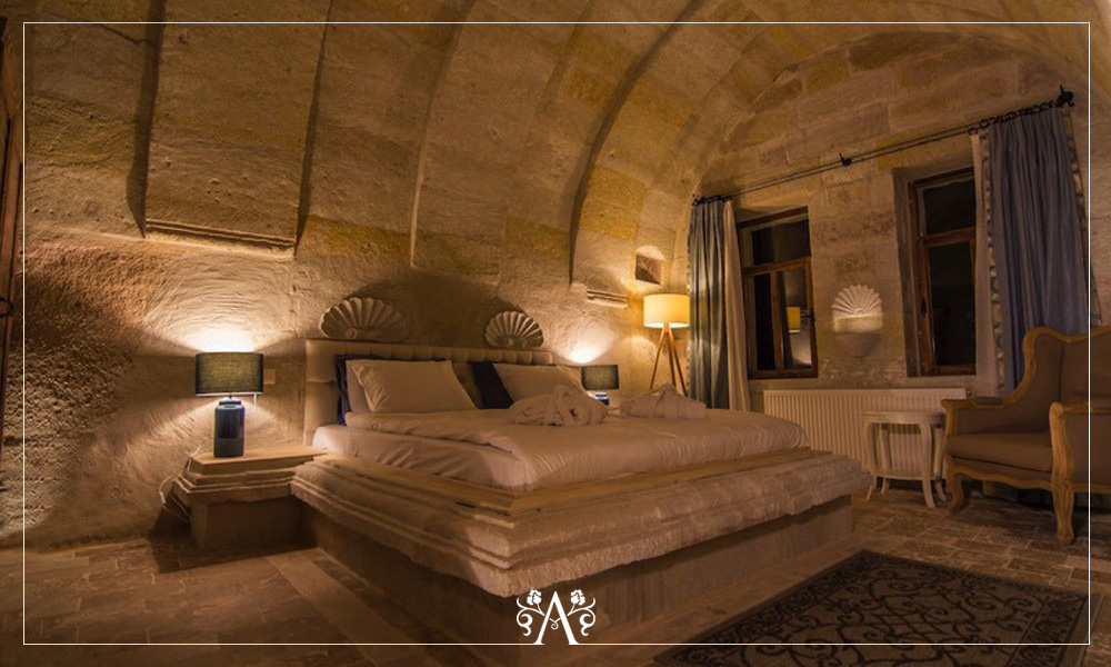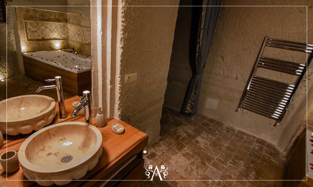 The President Cave Suite is a very special cave with a wonderful balcony where you can see the Cavusin castle and the balloons in the morning. This cave has a large living room with fireplace and large flat screen TV. The bedroom consists of a spacious half-cave, half-arched room with a large window overlooking the magnificent Cavusin castle and the village. The bathroom is spacious and offers a double jacuzzi.